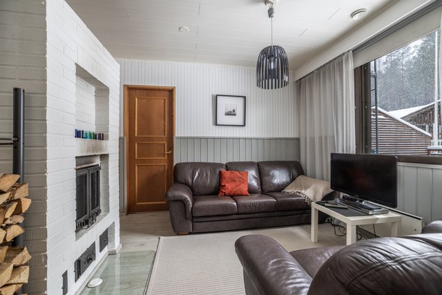 Takkahuoneessa on varaava takka, joka kutsuu viettämään viihtyisiä iltoja perheen ja ystävien kanssa.