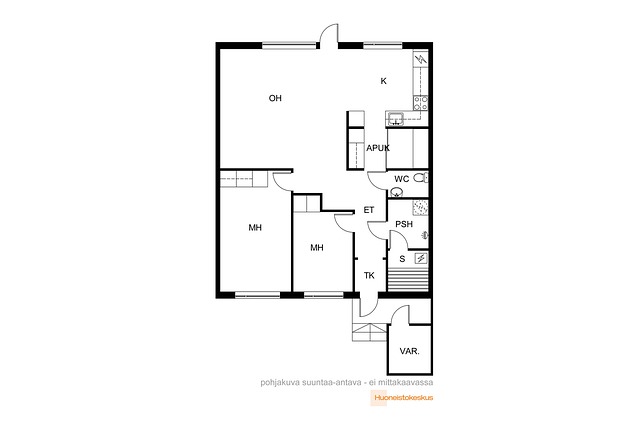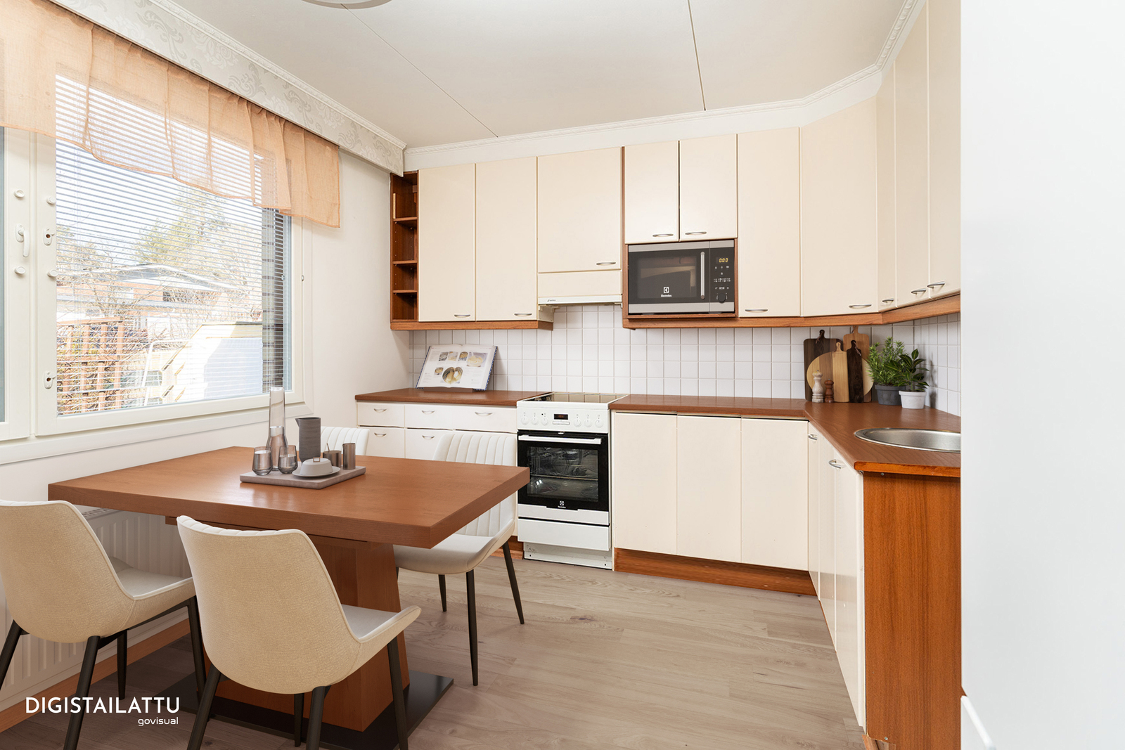 Keittiö ja olohuone yhtenäistä tilaa ja kaksi mukavankokoista makuuhuonetta.