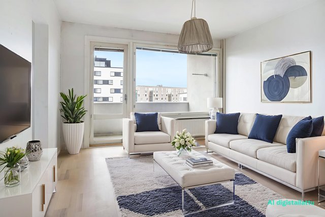 Asunnon tilava olohuone ja keittiö luovat toimivan kokonaisuuden, ja modernit kodinkoneet, kuten astianpesukone ja mikroaaltouuni, tekevät keittiöstä käytännöllisen. Eteisen yhteydestä löytyy käytännöllinen vaatehuone takeille ja kengille.