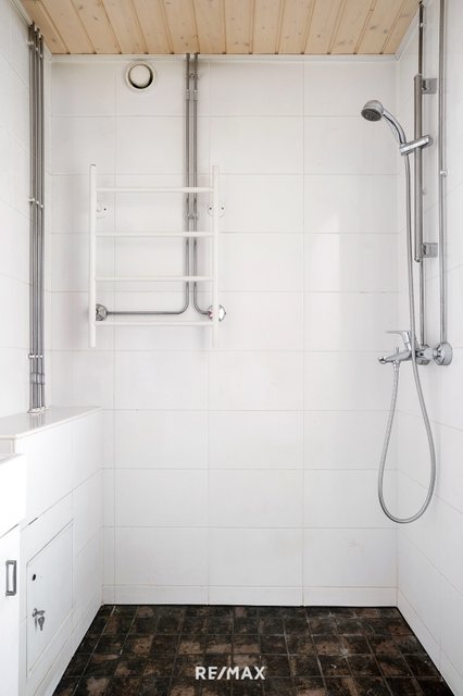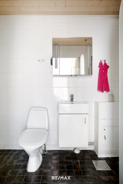 - WC-istuin, suihku, suihkuseinä, pesukoneliitäntä, peilikaappi, pesuallas, ja allaskaappi