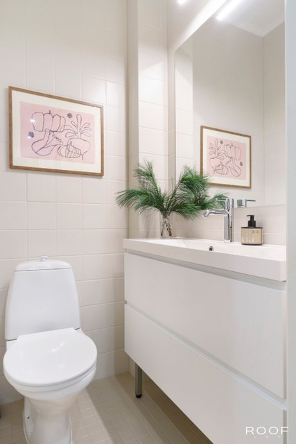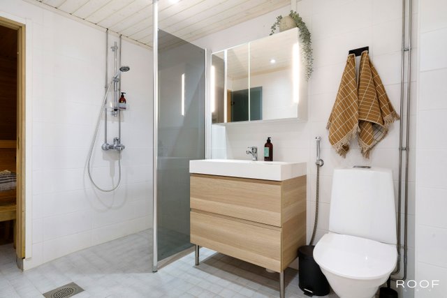 - WC-istuin, suihku, suihkuseinä, lattialämmitys, peilikaappi, peili, allaskaappi, ja bidee-suihku