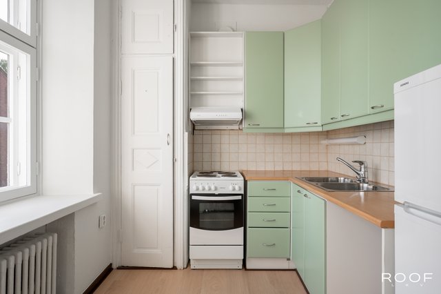 - SEINÄT: Maali ja laatta LATTIA: Laminaatti VARUSTELU: Liesituuletin, hana, kaapisto, allas, jääkaappipakastin, sähköliesi, pesukoneliitäntä