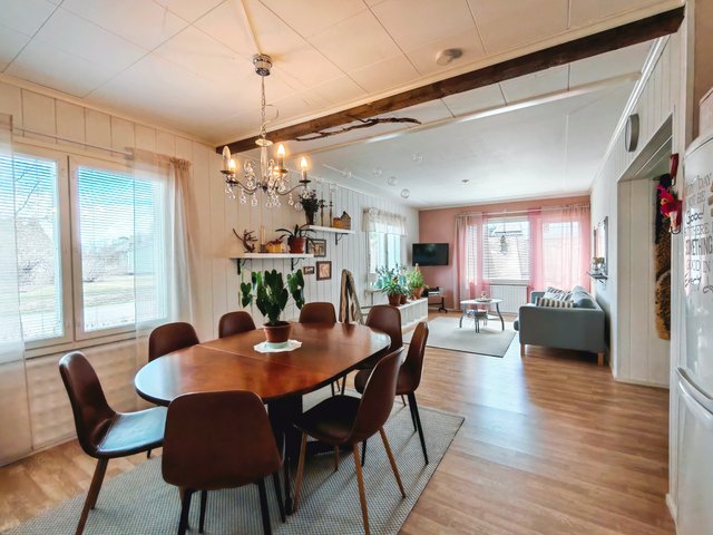Persoonallinen ja kodikas omakotitalo Tornion Saarenpäässä. Avara, valoisa tupakeittiö houkuttelee viettämään yhteistä aikaa ja makuuhuoneita on kolme. Iso katettu terassi etelään on lämmin jo varhain keväällä. Talossa on tehty runsaasti mittavia remontteja ja laajennuksessa 2017 rakennettu uudet pesutilat sekä sauna pukuhuoneineen. Edullisista käyttökustannuksista huolehtii yhdessä varaava takka, kaukolämpö sekä ilmalämpöpumppu.