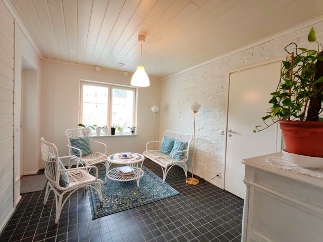 - Pukuhuone/oleskeluhuone laajennusosalla: Laattalattia, aitokivilaatta/maalattu seinä, kulku katetulle terassille. Varastohuone (puolilämmin)