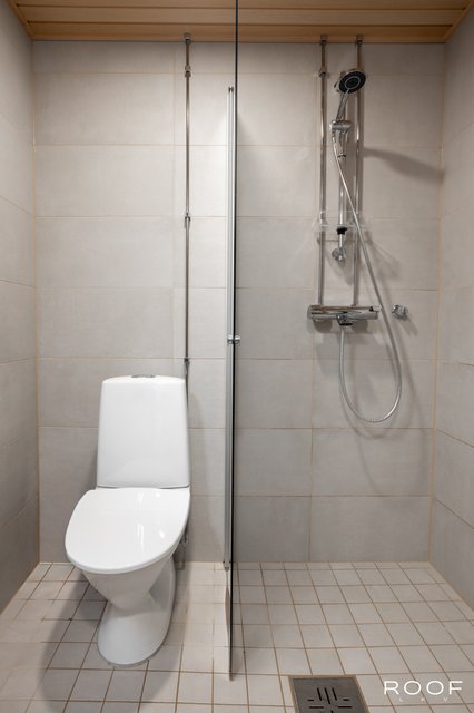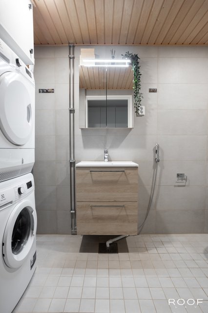 - WC-istuin, suihku, suihkuseinä, pesukoneliitäntä, peilikaappi, allaskaappi, pesuallas, bidee-suihku, lattialämmitys, pesukone, ja kuivausrumpu