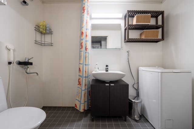 - WC-istuin, suihku, pesukoneliitäntä, pesuallas, ja peili