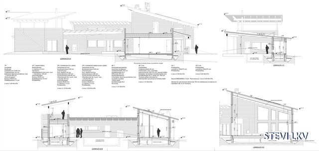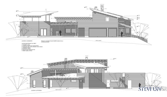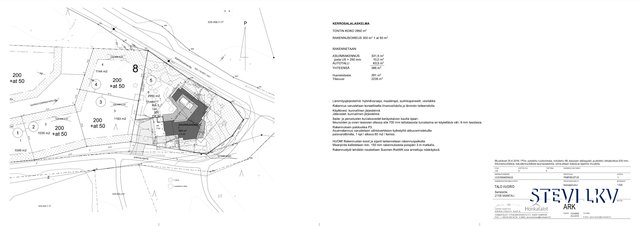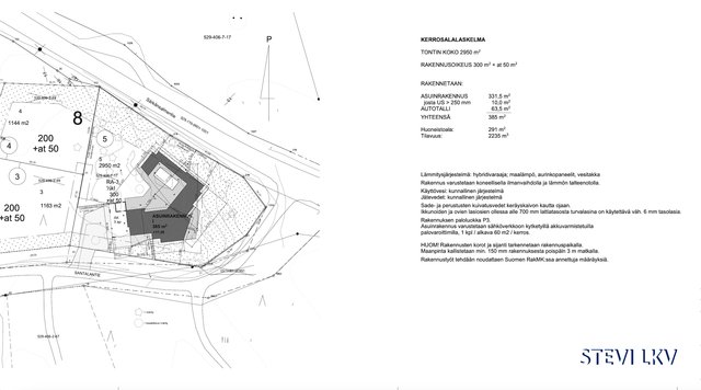 - Piirrustusten mukaan huoneistoala on 291m2 (kerrosala 331,5m2). Lisäksi autotalli 63,5m2.