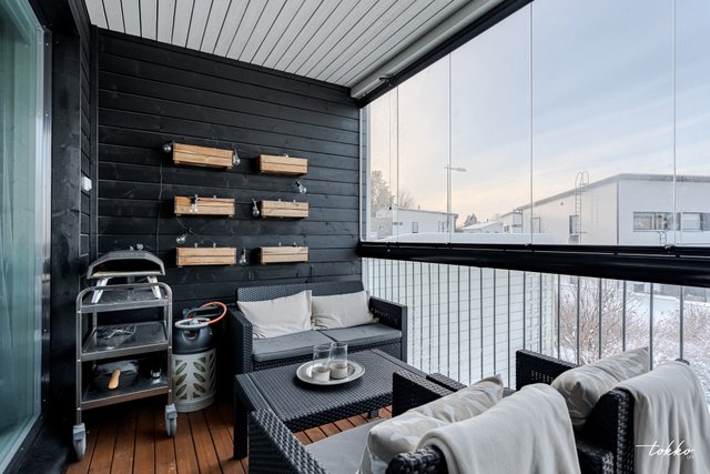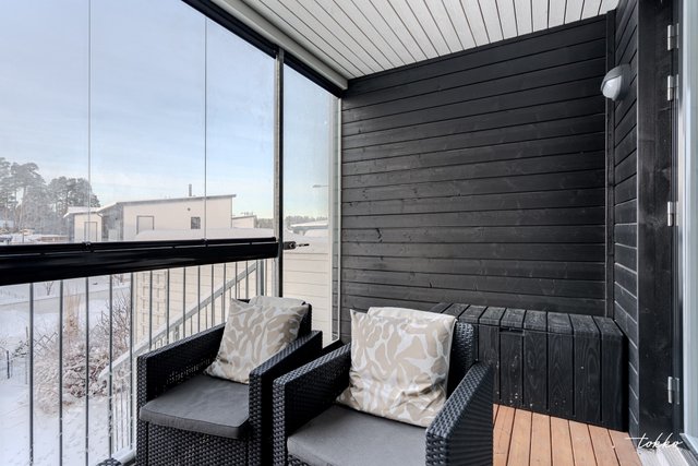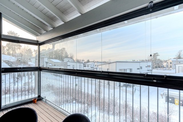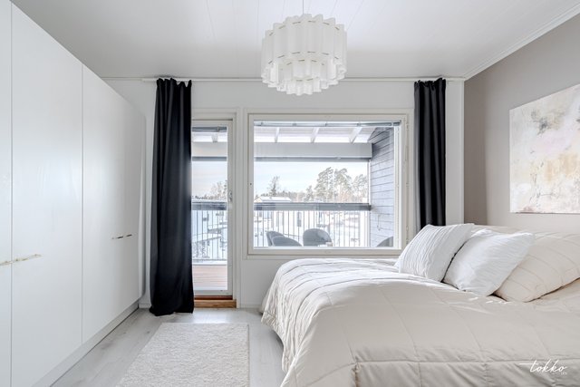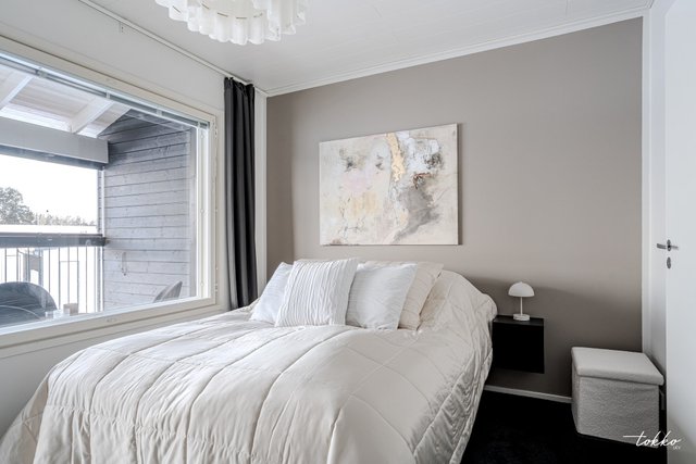 - Kaksi makuuhuonetta, joista molemmat reilun kokoisia. Toisesta makuuhuoneesta käynti lasitetulle länsiparvekkeelle.