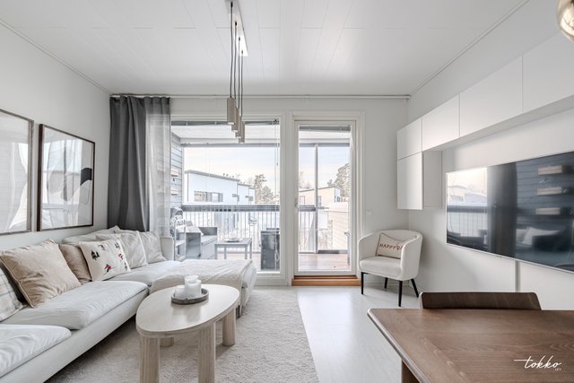 Asunnon sydän on valoisa ja avara olohuone–keittiöyhdistelmä. Keittiössä on runsaasti säilytys- ja työskentelytilaa, ja ruokapöydälle löytyy luonteva paikka keittiön ja olohuoneen välistä. Olohuoneesta on käynti suojaisalle länteen avautuvalle pihalle sekä lasitetulle terassille, joka lisää asumismukavuutta aikaisesta keväästä myöhäiseen syksyyn.