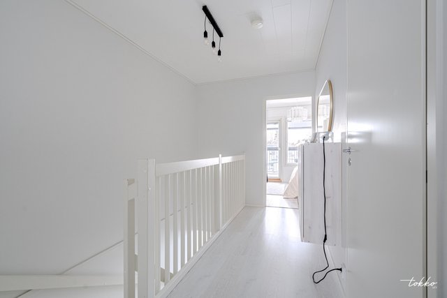 Yläkertaan sijoittuvat kaksi reilunkokoista makuuhuonetta omassa rauhassaan. Toisesta makuuhuoneesta on käynti parvekkeelle, josta avautuvat näkymät vehreälle pihapiirille. Yläkerran kylpyhuone ja oma sauna tuovat arkeen ripauksen luksusta, kun taas alakerran erillinen wc ja kodinhoitotila helpottavat lapsiperheen arkea. Alakerran wc:ssä on lisäksi suihkuvaraus.