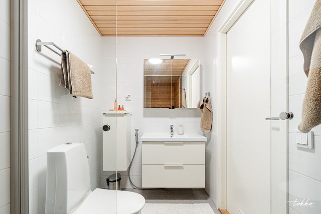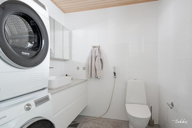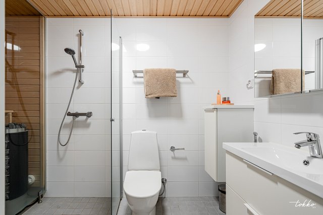 - Yläkerrassa reilun kokoinen kylpyhuone jossa oma sauna. Valkoinen seinälaatta, vaaleanharmaa lattialaatta.