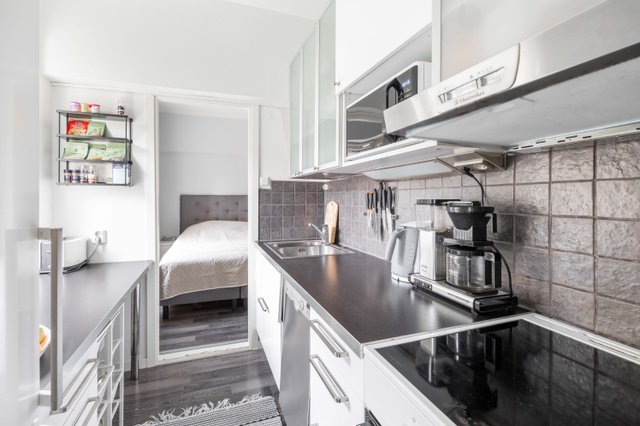 Keittiö on hyvin varusteltu, ja sieltä on käynti molempiin huoneisiin, mikä tekee tilankäytöstä sujuvaa. Olohuoneesta on kulku länsiparvekkeelle. Kylpyhuoneessa on mukavuutta lisäävä lattialämmitys. Asunnossa on myös vaatehuone, joka tarjoaa runsaasti säilytystilaa.