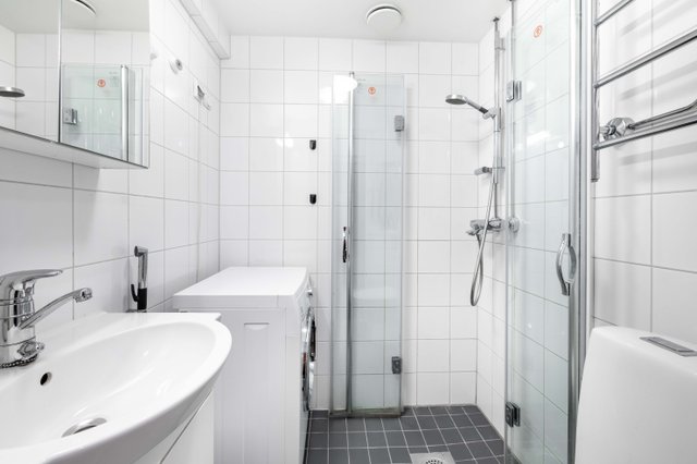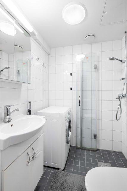 - WC-istuin, suihku, suihkuseinä, pesukoneliitäntä, lattialämmitys, peilikaappi, allaskaappi, ja pyyhepatteri
