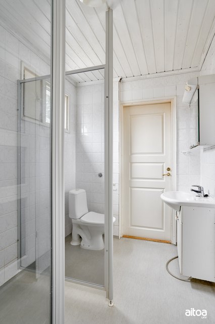- WC-istuin, suihku, suihkuseinä, lattialämmitys, peilikaappi, pesuallas, bidee-suihku, ja allaskaappi
