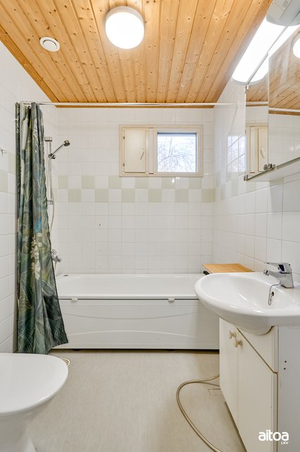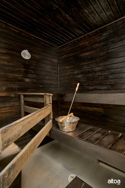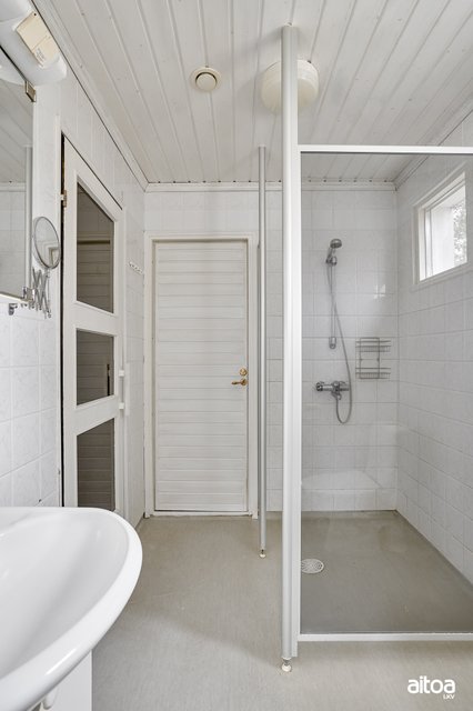 - Saunaosaston yhteydessä kylpyhuone, jossa suihku, wc istuin, peilikaappi, pesuallas ja allaskaappi.