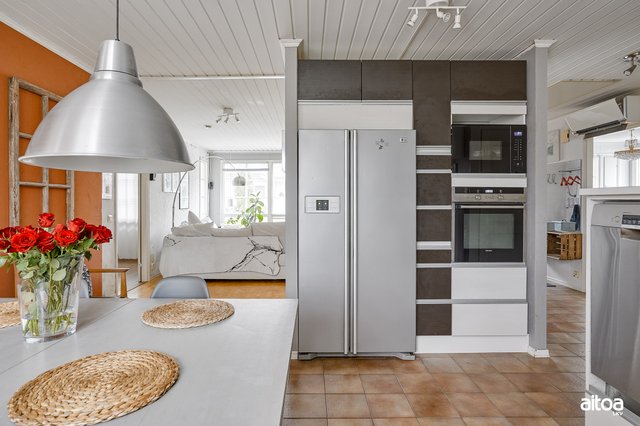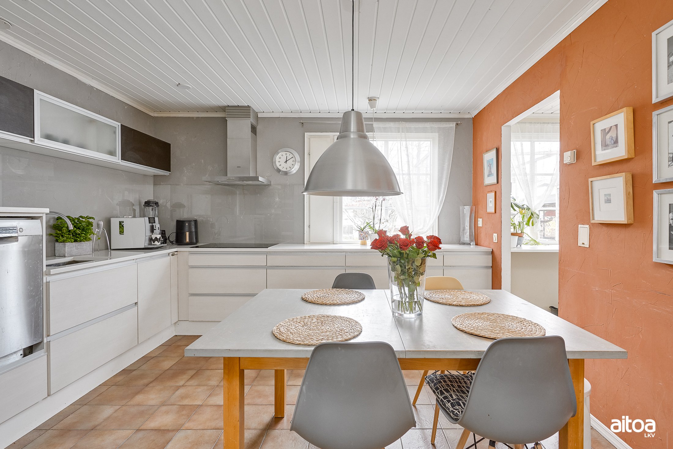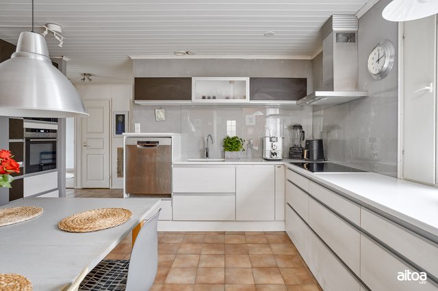 Tämän talon silmäterä on 2013 uusittu keittiö, jossa on laadukkaat Siemensin ja Boschin kodinkoneet sekä kvartsikomposiittitasot. Kylpyhuoneita löytyy peräti kaksi, joten perhearjessa tilat palvelevat aktiivisempaakin harrastajaa.