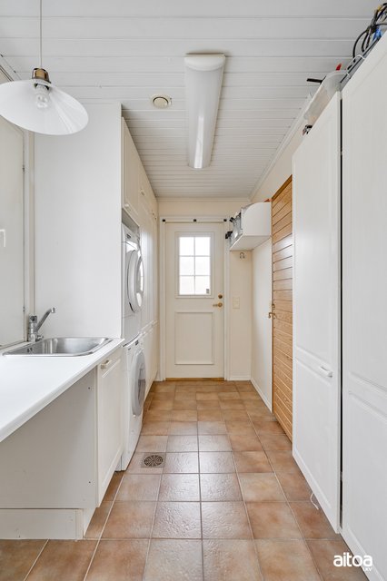 - Pesukoneliitäntä, lattialämmitys, pöytätaso, tila pesutornille, pesuallas, ja kaapistot