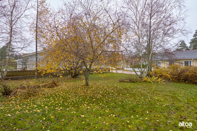 - Tasainen pihapiiri, jossa nurmikkoa ja kirsikkapuu.