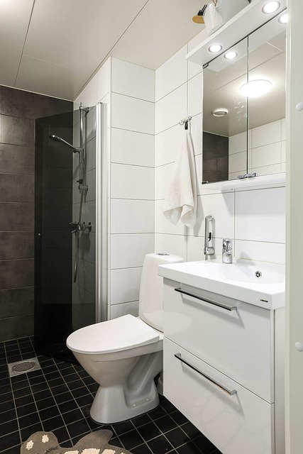 - Lattialämmitys, pesukoneliitäntä, suihkuseinä, wc-istuin, peilikaappi, ja suihku