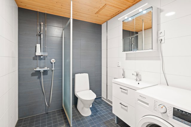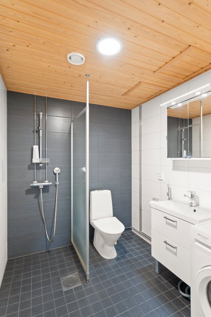 - WC-istuin, suihku, suihkuseinä, pesukoneliitäntä, peilikaappi, pesuallas, allaskaappi, ja bidee-suihku
