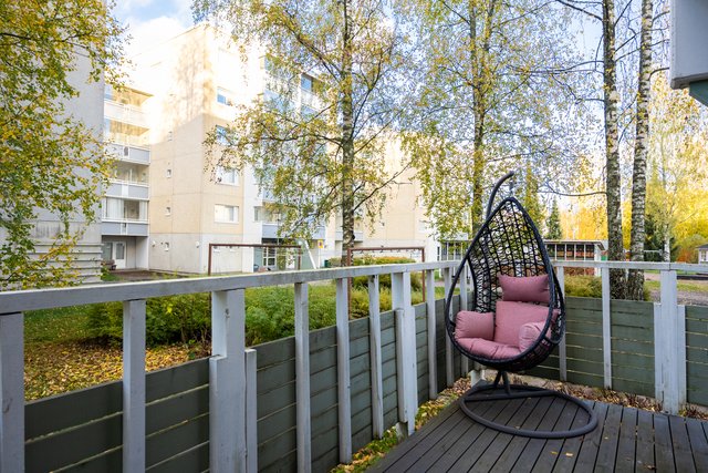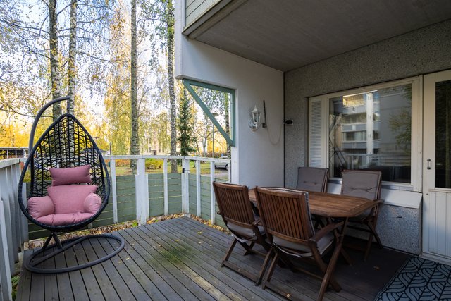Omalla terassilla varusteltu muuttokuntoinen kolmio suositulta Jalkarannan alueelta.