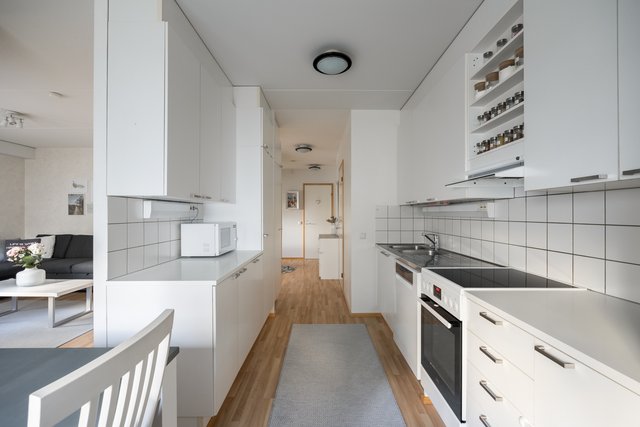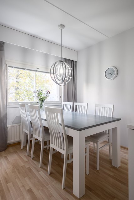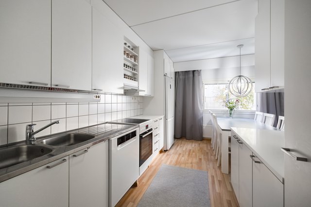 - Vaalean sävyinen keittiö, tilaa ruokailuryhmälle.
