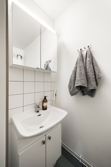 - Peilikaappi, allaskaappi, pesuallas, peili, pesukoneliitäntä, suihku, ja suihkuseinä