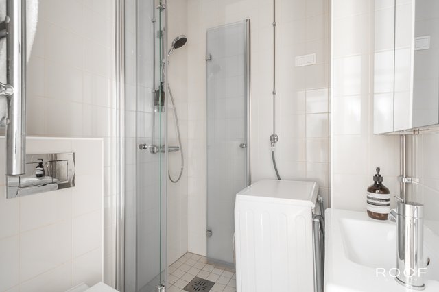 - Kaakeliseinät ja laattalattia. Suihku, suihkuseinä, seinä-WC, peilikaappi, allaskaapisto, pesukoneliitäntä, rättipatteri, lattialämmitys.