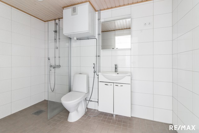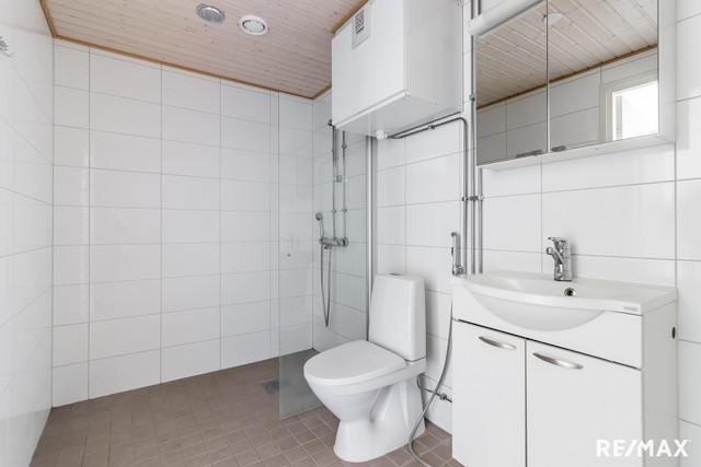 - WC-istuin, suihku, suihkuseinä, pesukoneliitäntä, lattialämmitys, peilikaappi, pesuallas, allaskaappi, ja bidee-suihku