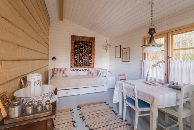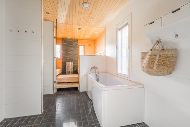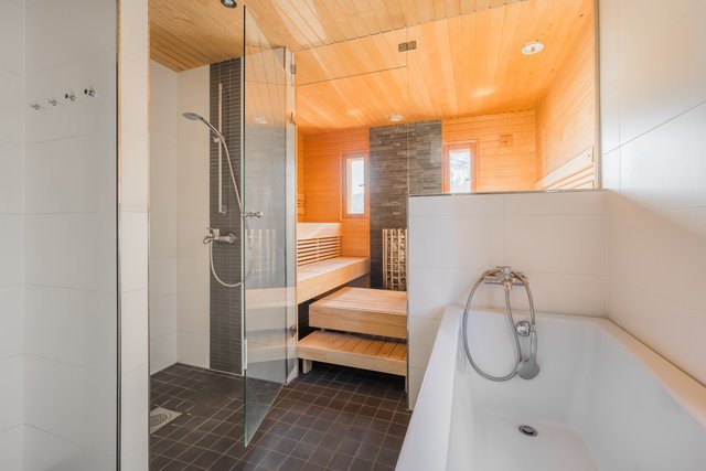Talossa on oma sauna sähkökiukaalla, ja rinteessä sijaitseva erillinen pihasauna tarjoaa puusaunan löylyt omassa rauhassa – täällä on ihana rentoutua vuodenajasta riippumatta.