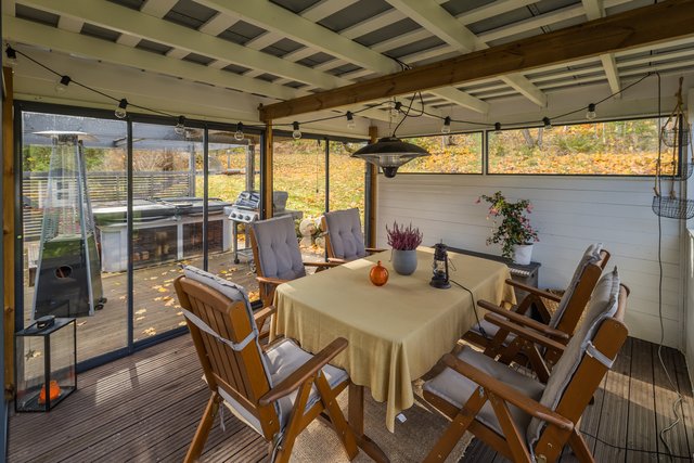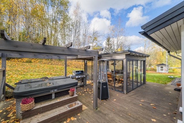 Lasitettu terassi jatkaa oleskelutilaa ulos ja sieltä on suora pääsy ulkoporealtaaseen. Suuri oma tontti tarjoaa runsaasti tilaa puutarhanhoitoon ja ulkoiluun. Pihalla on kahden auton autotalli sekä robottiruohonleikkuri helpottamassa arkea.