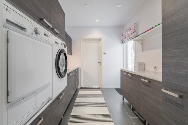 - Lattiakaivo, pyykkikaapit, silityspöytä/taso, keskuspölynimuri, pesukoneliitäntä, pesuallas, ja lattialämmitys