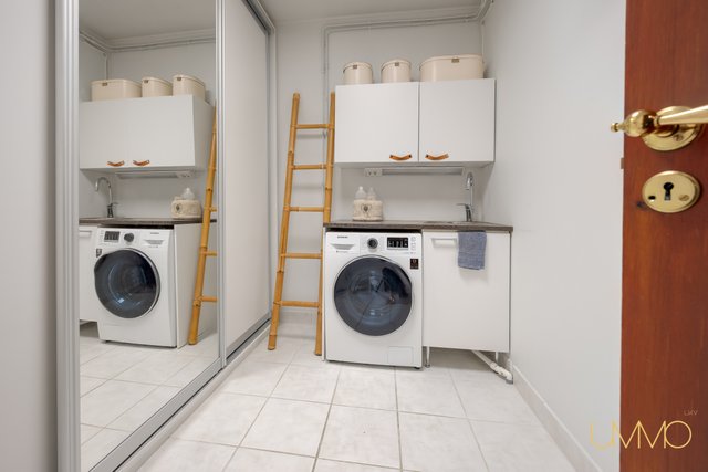 - Pesukoneliitäntä, lattialämmitys, pesukone, ja pöytätaso