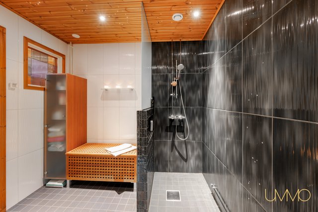 - Lattialämmitys, suihkuseinä, kaapisto, ja suihku