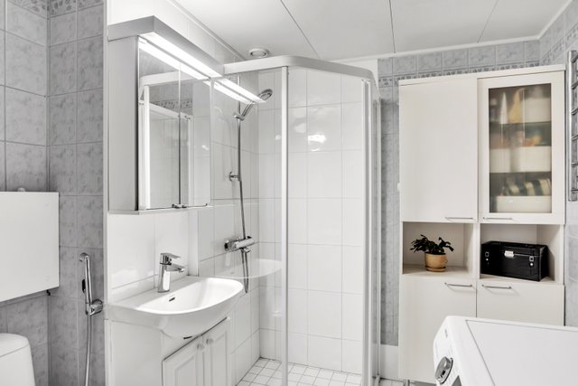 - WC-istuin, suihku, suihkukaappi, pesukoneliitäntä, peilikaappi, pesuallas, bidee-suihku, ja allaskaappi