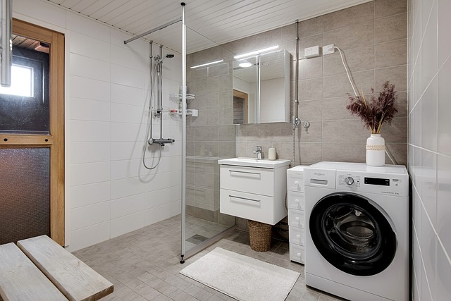 - Peilikaappi, suihkuseinä, suihku, pesukoneliitäntä, ja kiinteät valaisimet