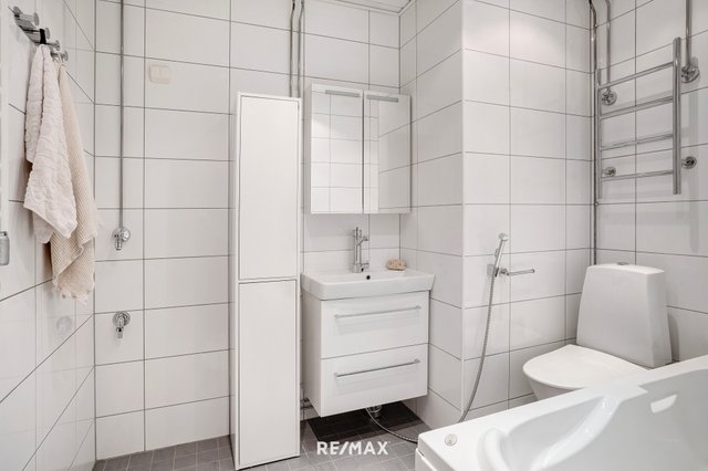 - WC-istuin, kylpyamme, pesukoneliitäntä, bidee-suihku, allaskaappi, pesuallas, ja lattialämmitys