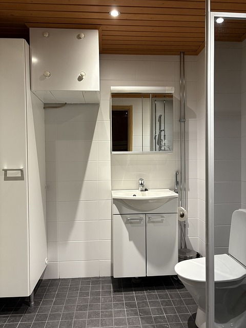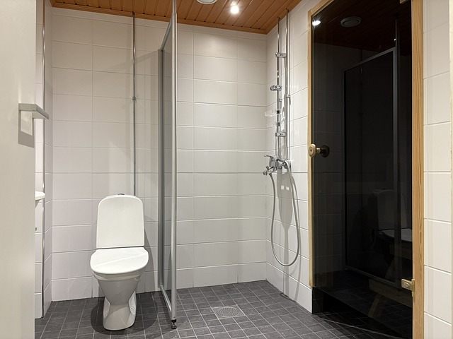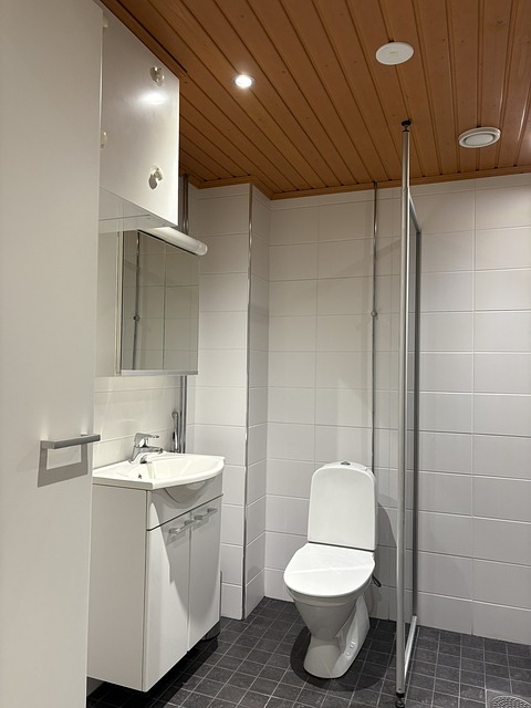 - Suihkuseinä, lattialämmitys, pesukoneliitäntä, wc-istuin, peilikaappi, ja allaskaappi