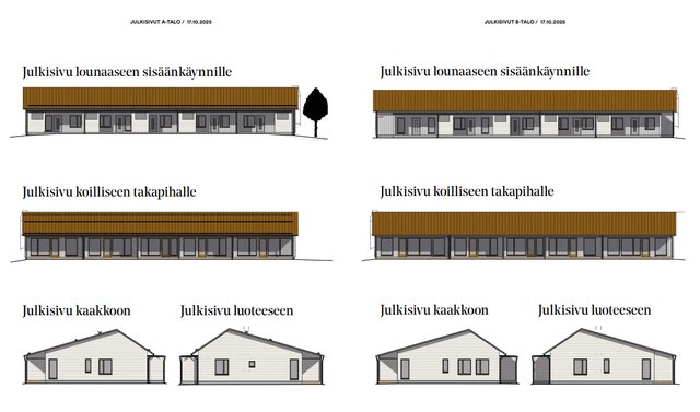 - Alapohja on lämpöeristetty maanvarainen teräsbetonilaatta. Yläpohjat tehdään puurakenteisina. Yläpohjan lämmöneristemateriaalina on puhallusvilla.. Ulkoseinät paneeliverhottuja puuelementtejä.