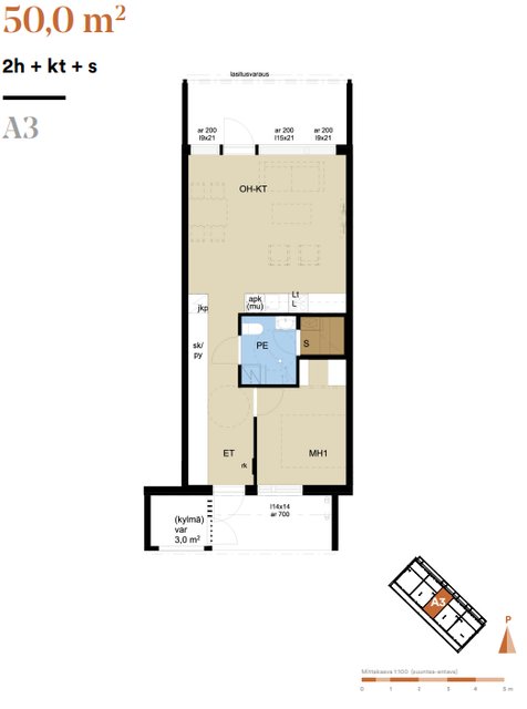 - ET, OH, KT, MH ja VH: vinyyli. PE, sauna, WC ja KHH: laatoitettu.