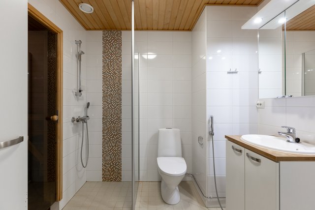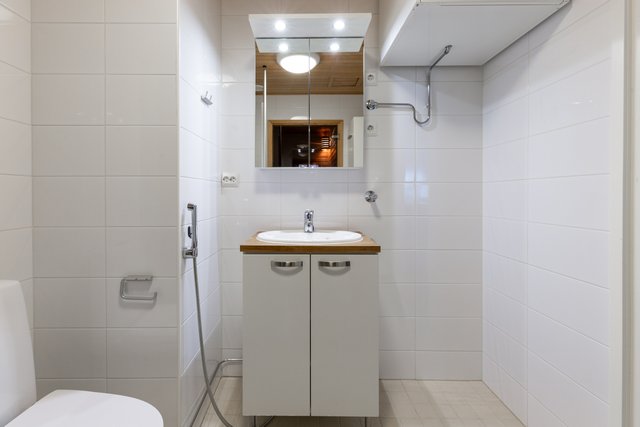 - WC-istuin, suihku, suihkuseinä, pesukoneliitäntä, lattialämmitys, peilikaappi, allaskaappi, ja bidee-suihku
