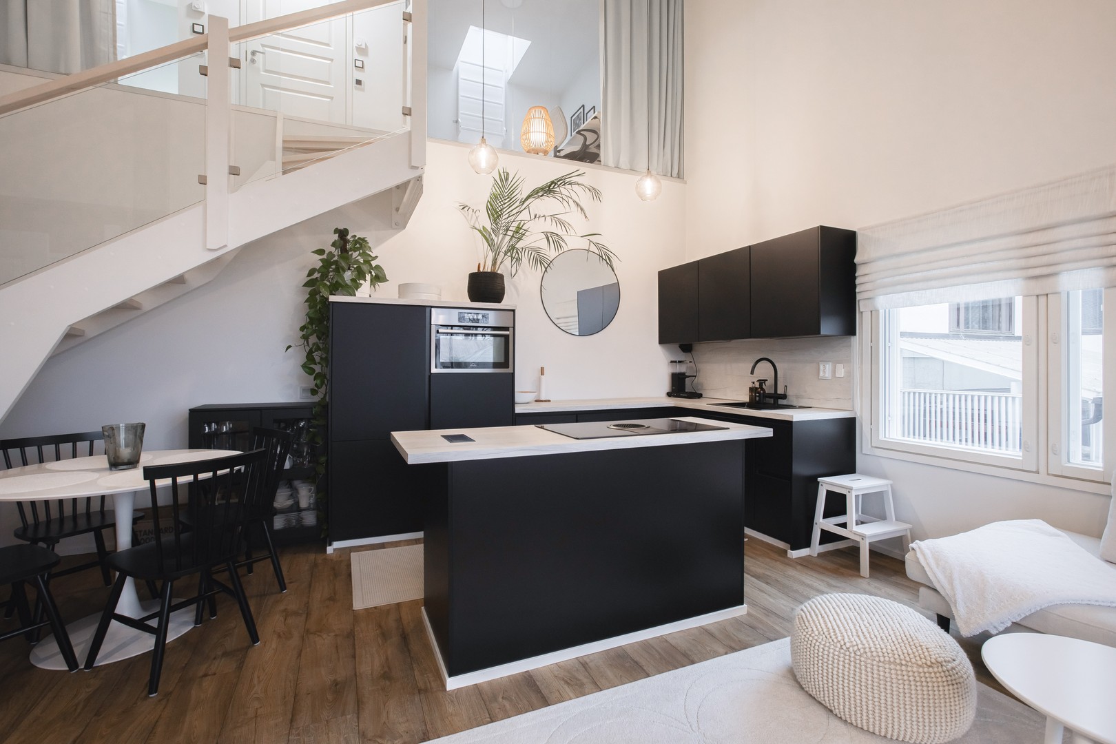 Tämä kivirakenteinen rivitalo on hyvällä, suojaisalla sijainnilla kaikkien palveluiden äärellä. Olohuoneessa on näyttävät isot ikkunat ja yli 3m huonekorkeus. Keittiö on moderni ja käytännöllinen. Lisää säilytystilaa keittiöön tuo saareke, jossa on liesi ja upotettu liesituuletin. Kauniisti toteutettu kylpyhuone ja ikkunallinen sauna, jossa lasiseinä, tunnelmavalaistus ja Tulikiven kiuas. Oman saunan löylyistä on mukava mennä vilvoittelemaan lasitetulle terassiparvekkeelle. Yläkerrassa on viihtyisät makuuhuoneet ja erillinen wc. Tässä kodissa on sitä jotain - tilaa, toimivuutta ja hienoja yksityiskohtia.