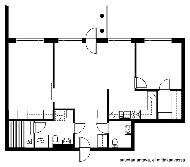 - Näkymät olohuoneesta, molemmista makuuhuoneista, keittiöstä ja parvekkeelta kaakon suuntaan sisäpihalle päin.