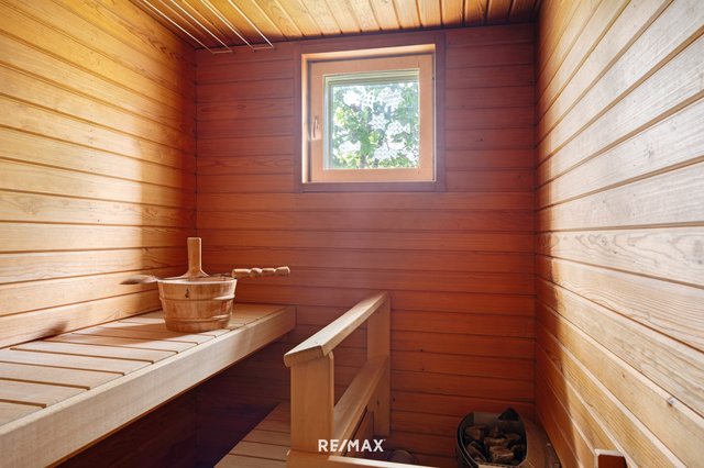 - Ikkunallinen sauna, jossa sähkökiuas (uusittu 2018) Seinät paneelia, lattia laattaa.