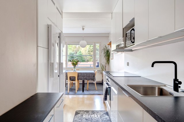 - 2023 uusittu Epoq-keittiö. Täyskorkeat Upon jääkaappi ja pakastinkaappi, induktioliesitaso, erillisuuni (pyrolyysi), astianpesukone, liesituuletin (huippuimuri). Työtasot laminaatti, lattia parkettia.