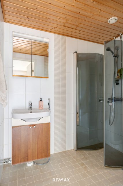 - Alakerrassa 2008 uusittu kylpyhuone, jossa peilikaappi, allaskaappi, suihku, suihkuseinä. Seinät ja lattia laatoitettu, lattialämmitys. Kosteusmittaus 9 / 2025.