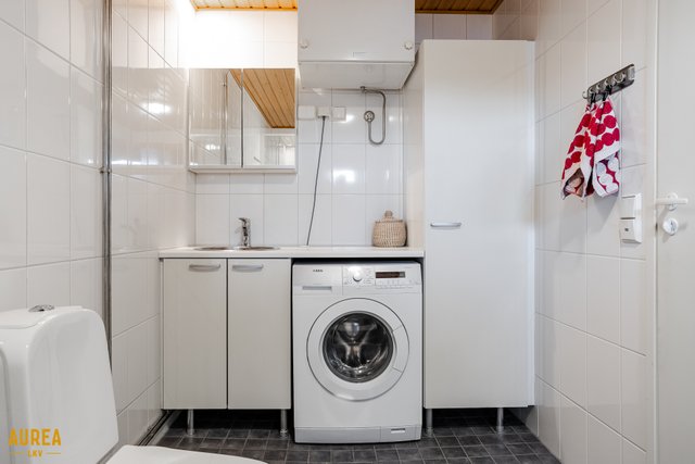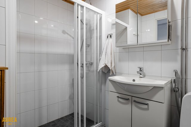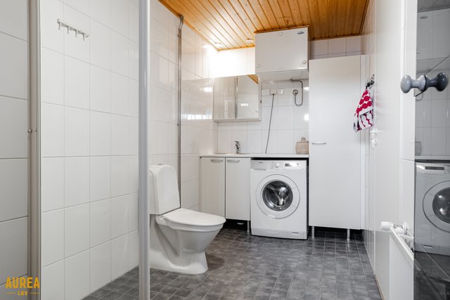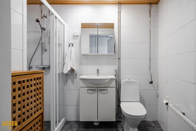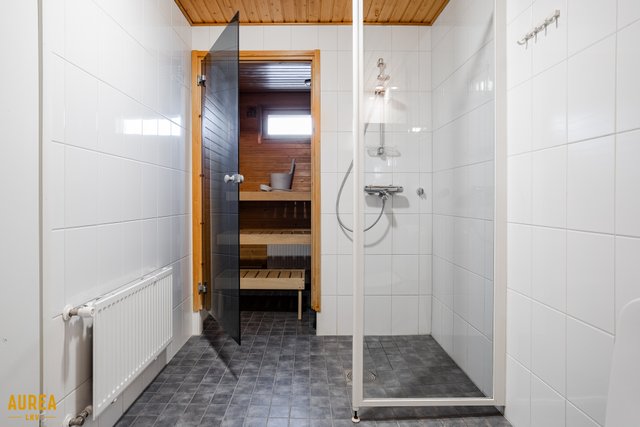 - Kodin kylpyhuone ja sauna sijaitsevat yläkerrassa, ja kylpyhuone on laatoitettu sekä varustettu saniteettikalustein ja pyykkikoneiden liitäntöineen. Lattialämmitys lisää käyttömukavuutta. Alakerrassa on tilava erillinen wc, jossa on myös suihkutila, mikä tekee arjen sujuvaksi ja kodin tiloista toimivat koko perheelle.
