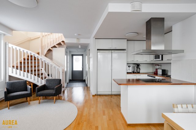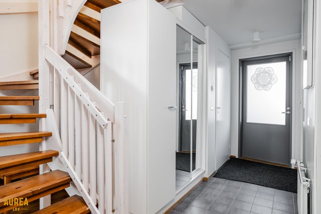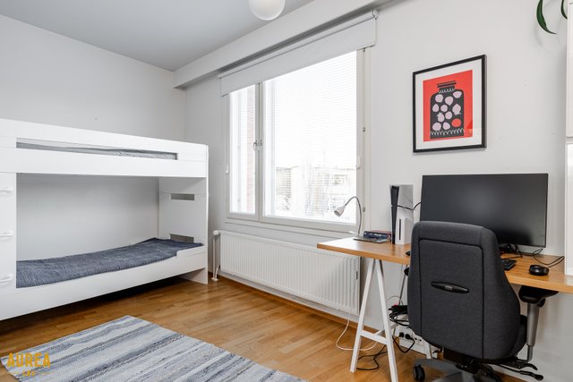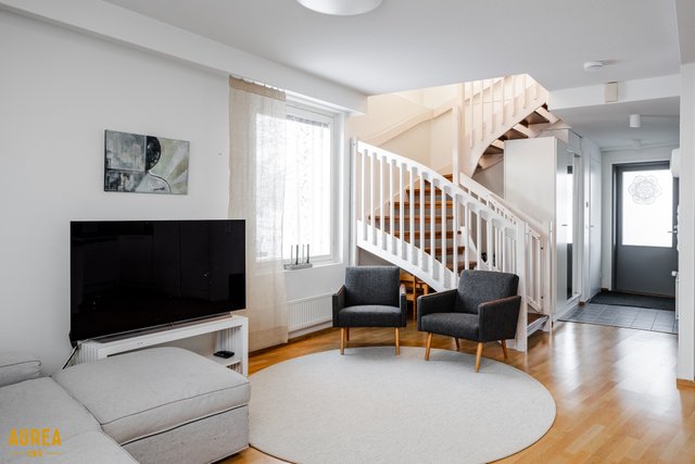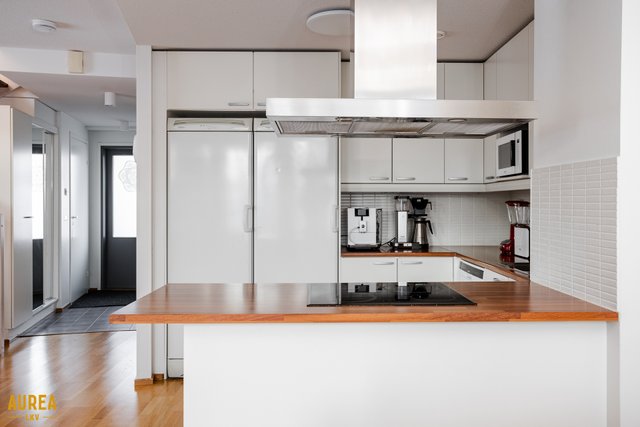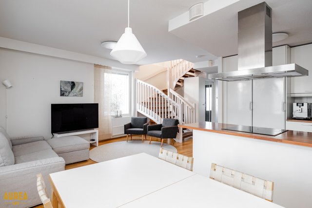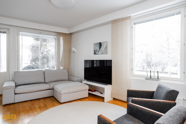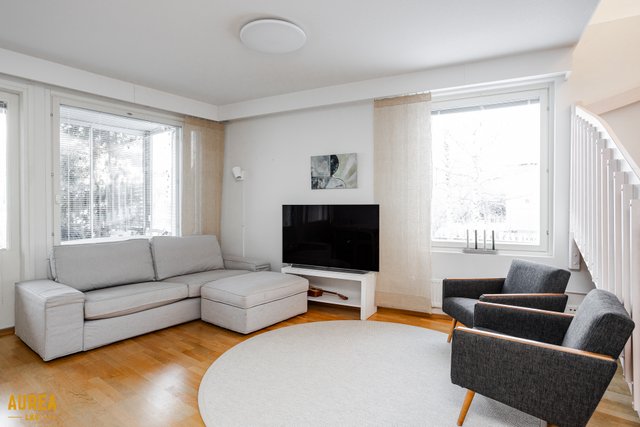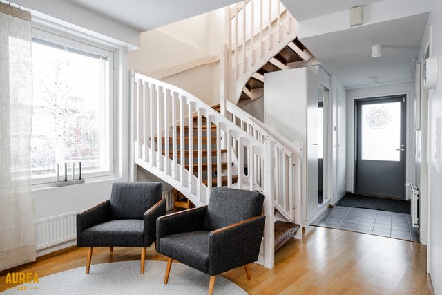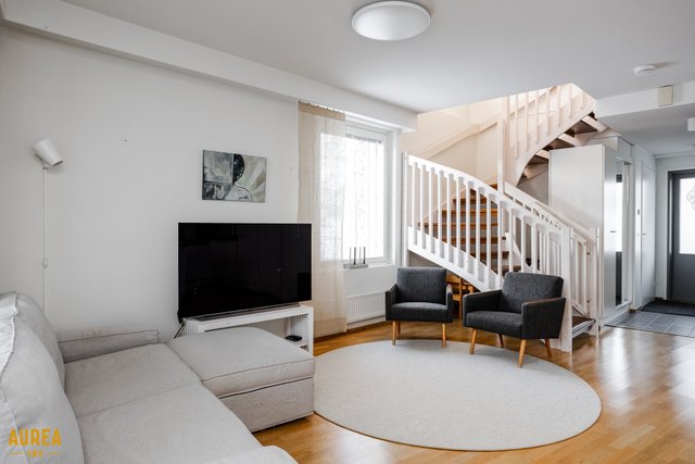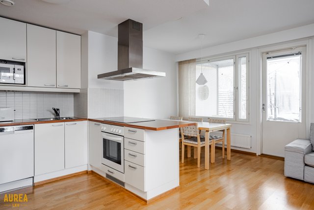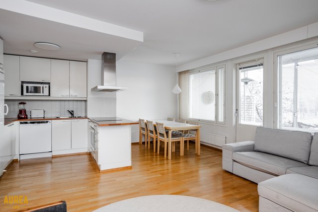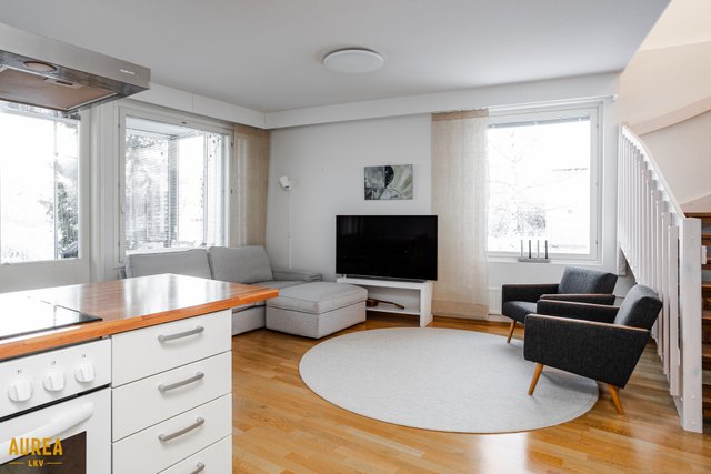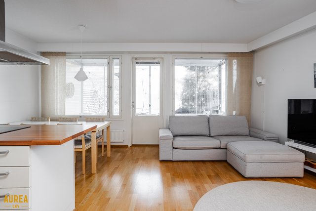 Koti on erittäin siistissä kunnossa, ja materiaalivalinnat on tehty hyvällä maulla, korostaen ajattomuutta ja viihtyisyyttä. Huoneiston tilat ovat valoisat, ja pohjaratkaisu on käytännöllinen. Vaaleat pinnat ja keittiön sekä olohuoneen avoin yhteys luovat tilaan avaruutta ja miellyttävän kokonaisuuden. Nykyaikainen ja hyvin varusteltu keittiö palvelee sujuvasti arjen tarpeita ja avautuu luontevasti olohuoneeseen. Olohuoneesta on käynti aurinkoiselle lasitetulle terassille, josta avautuu suojaisa ja viihtyisä oleskelupiha.