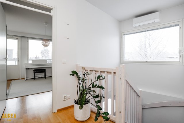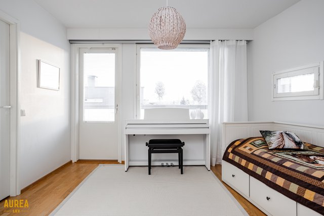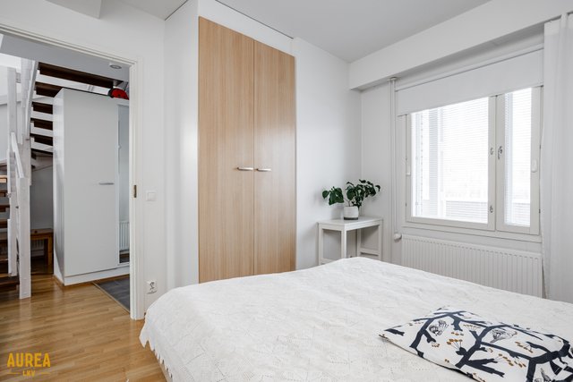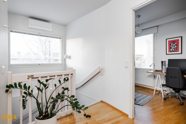 Alakerrassa sijaitsee yksi makuuhuone ja yläkerrassa kaksi lisää, joista suuremman yhteydessä on vaatehuone. Kylpyhuone on tilava, ja sen yhteydessä on oma sauna, jossa lattialämmitys tuo arkeen lisämukavuutta. Asumisen laatua täydentää takapihan puolelle sijoittuva poikkeuksellisen suuri lasitettu parveke. Huoneistossa on koneellinen ilmanvaihto lämmöntalteenotolla, ja etupihan puolella sijaitseva pihavarasto tuo kaivattua säilytystilaa. Huoneiston yhteydessä myydään erillinen autokatososake 7 900 euroa, jossa on sähköauton lataus.