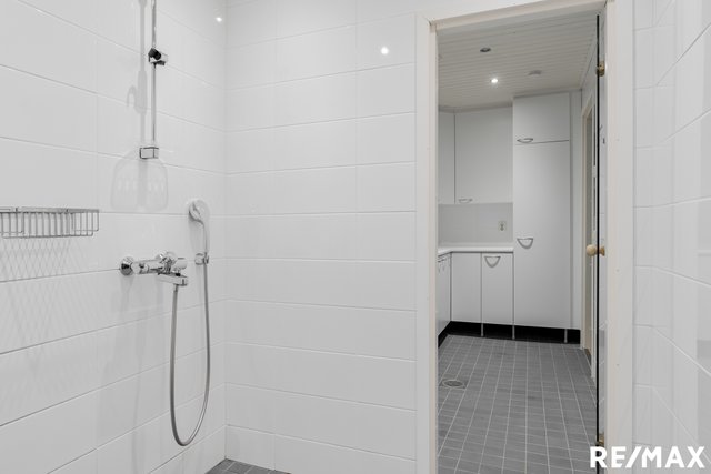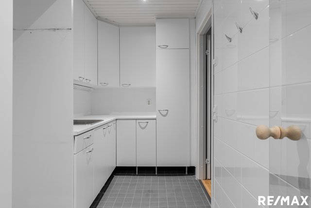 - Pesukoneliitäntä, lattialämmitys, lattiakaivo, pesuallas, pyykkikaapit, ja silityspöytä/taso